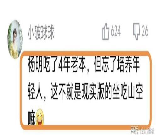 目睹辽宁队如今的悲惨现状,辽宁球迷也是在网络平台发表观点,矛头直指球队主教练杨鸣。“杨明吃了4年老本,但忘了培养年轻人,这不就是现实版的坐吃山空嘛”;“看看杨鸣创辽篮多少连败纪录”;“辽宁队现在基本上每一场比赛只能拿60来分,这样的比分拿什么赢球?”;“以前的辽宁队打比赛是从从容容游刃有余!现在是匆匆忙忙连滚带爬”;“杨鸣吃了郭士强四五年红利,终于原形毕露了”,“坐吃山空”……