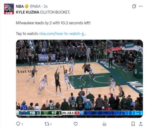 终场前1分34秒库兹马制造了米勒一个进攻犯规,随后罗林斯三分命中反超1分,紧接着布里奇斯突破命中黄蜂再领先1分,终场前11秒库兹马命中反超2分的关键三分球。
