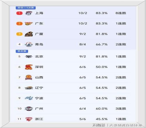 ②、险胜的广东男篮同样以10胜2负排名第二,广厦、青岛、北京三队分列3-5位;